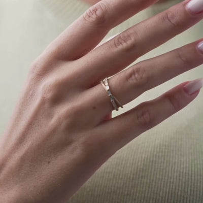 A modern and elegant criss cross ring with baguette and round cut diamonds gracefully crossing over each other.