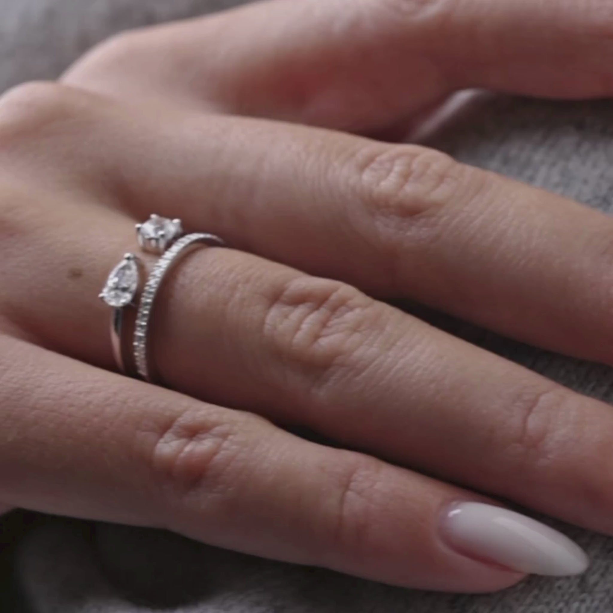 Modern, sculptural, and full of contrast. Our Gemini diamond ring features a 0.30ct pear shape diamond, a 0.23ct round brilliant diamond, and 0.18cts of pavé set diamonds along the band, giving a total carat weight of 0.71cts.