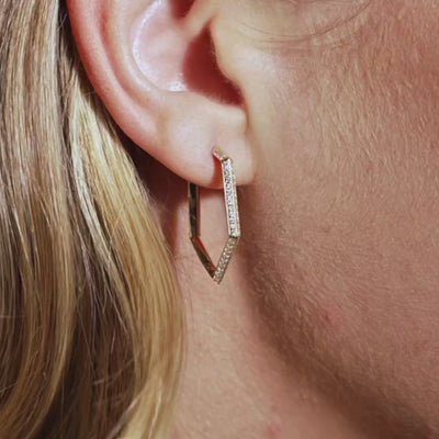 Sculptural, sleek, and full of edge. These geometric hoops are hand crafted in 18ct yellow, white, or rose gold and set with 0.36cts of certified diamonds, all F–G colour, VS–SI clarity. The knife-edge profile catches the light from every angle, creating brilliant sparkle with a modern twist. Refined, distinctive, and designed for effortless wear.
