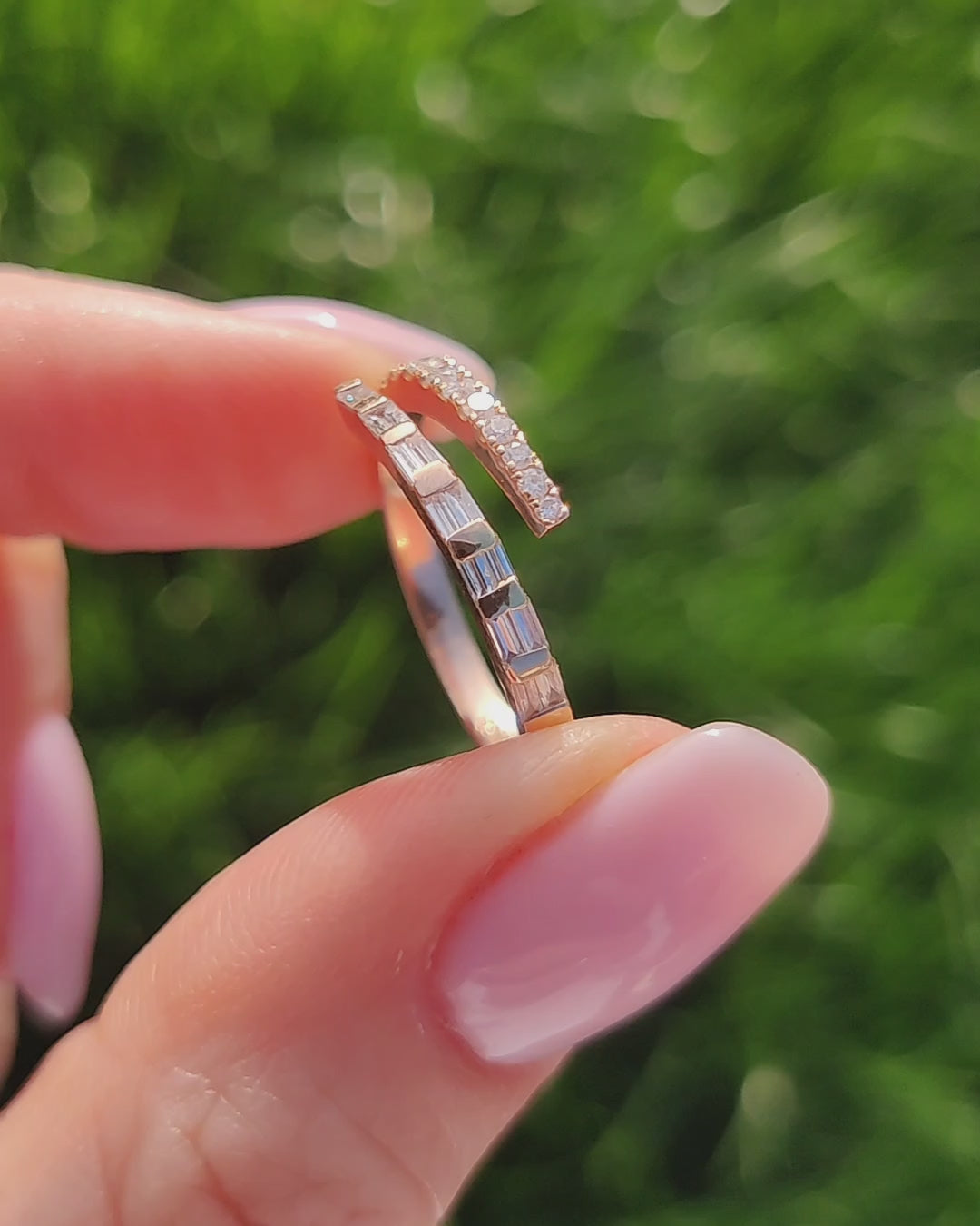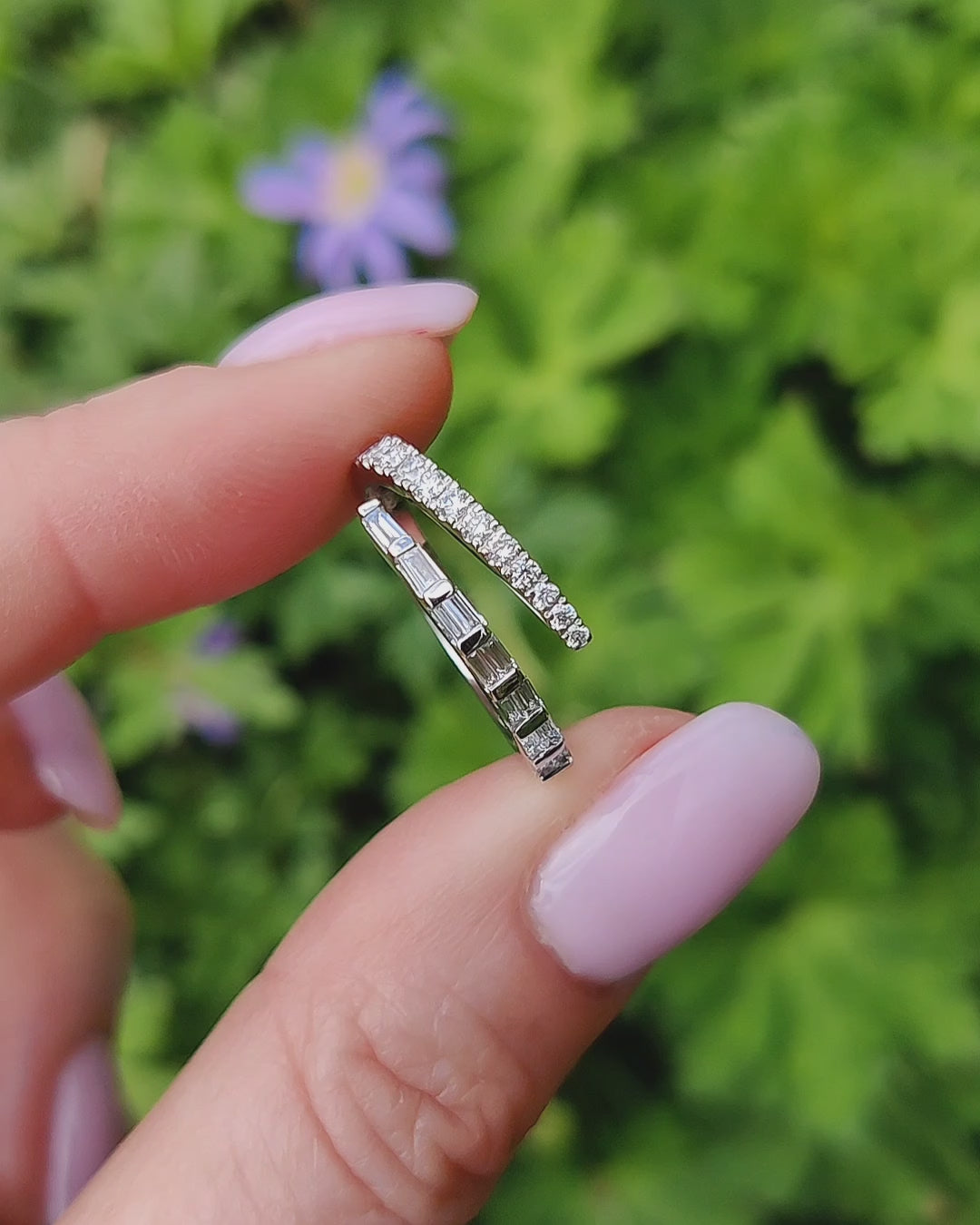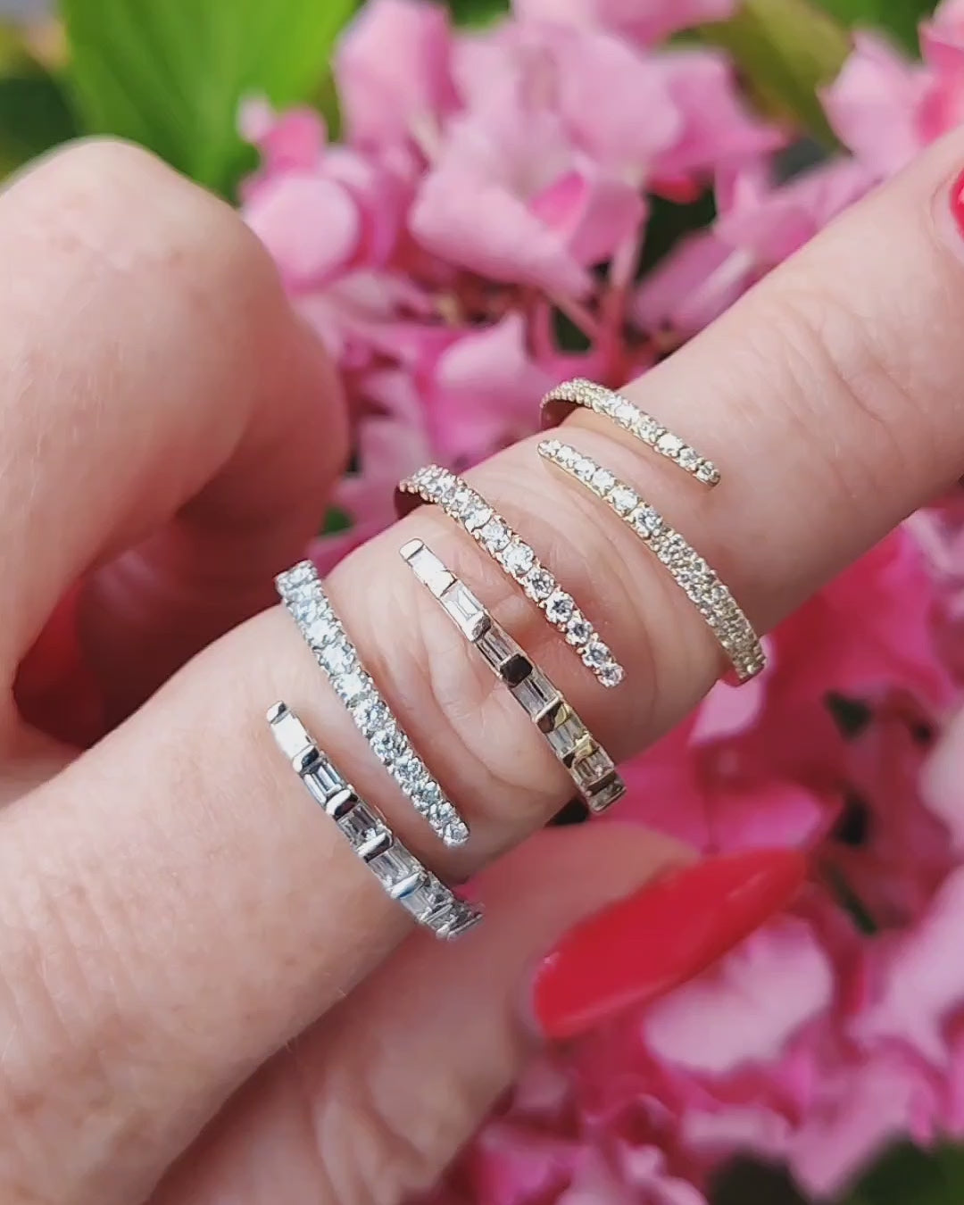 A firm favourite with our clients, this wrap ring features both round brilliant and baguette cut diamonds. Ultra cool and unique, it looks great as a thumb or index finger ring, and even as a wedding band!