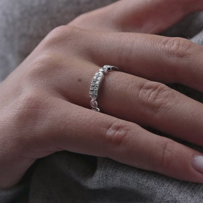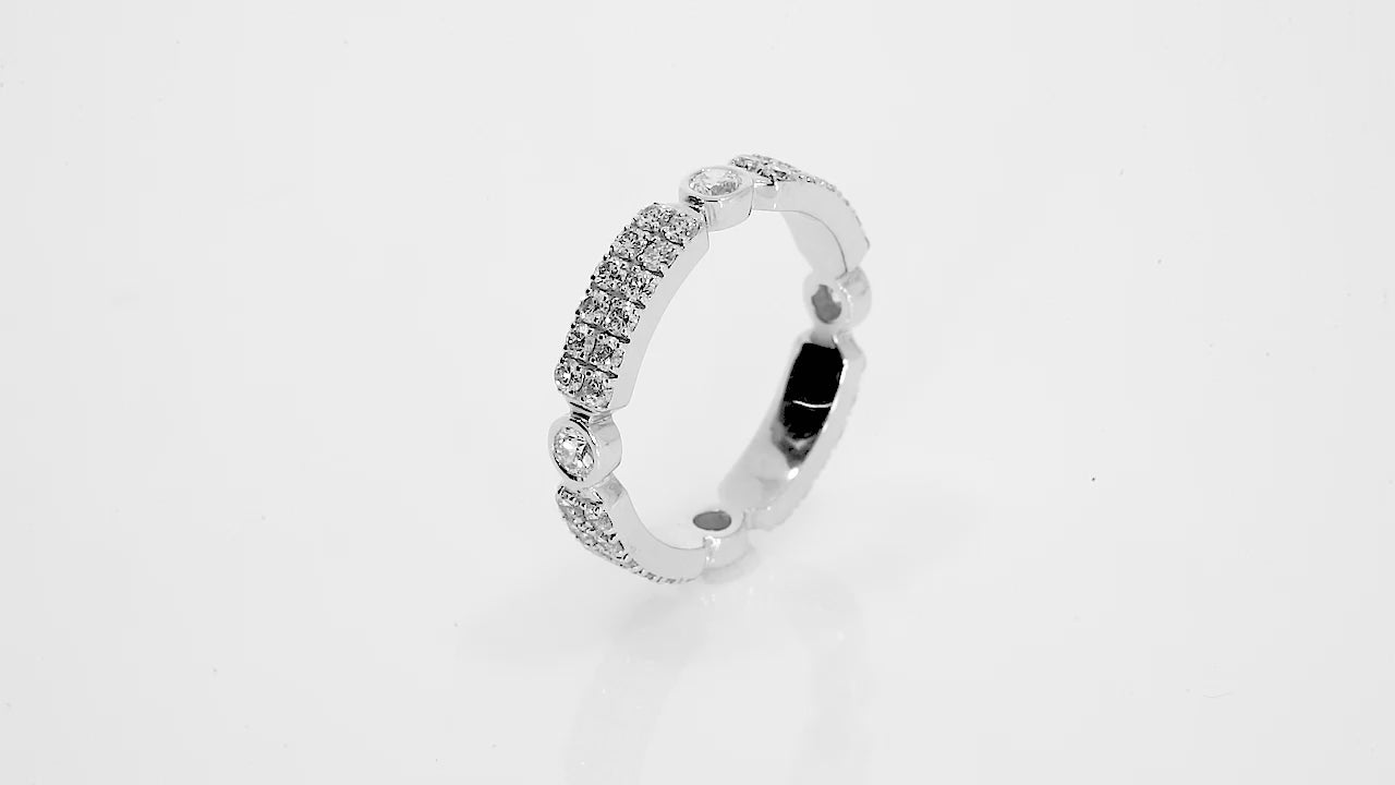 A bold, contemporary take on classic diamond band. The Alina ring features alternating sections of pavé set and smooth bezel set diamonds, creating a striking rhythm of light and form. The design combines clean geometry with classic lines for a refined, sculptural look.