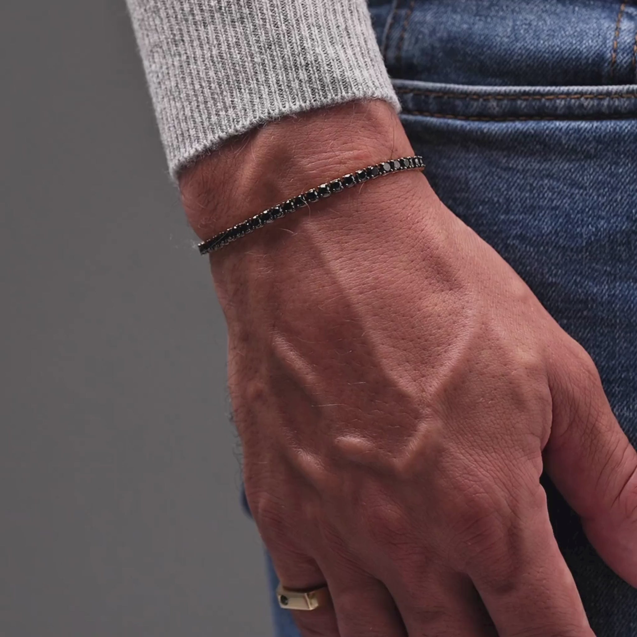 Bold, refined, and effortlessly modern. This striking tennis bracelet features 8.00cts natural black round brilliant cut diamonds, each expertly hand set for a seamless line of deep, mirror-like sparkle. Handcrafted in your choice of 18ct white, yellow, or rose gold, it delivers a sleek, sculptural look with a confident edge. Designed for those who appreciate understated luxury, this piece transitions effortlessly from day to night - powerful worn solo, distinctive when layered.