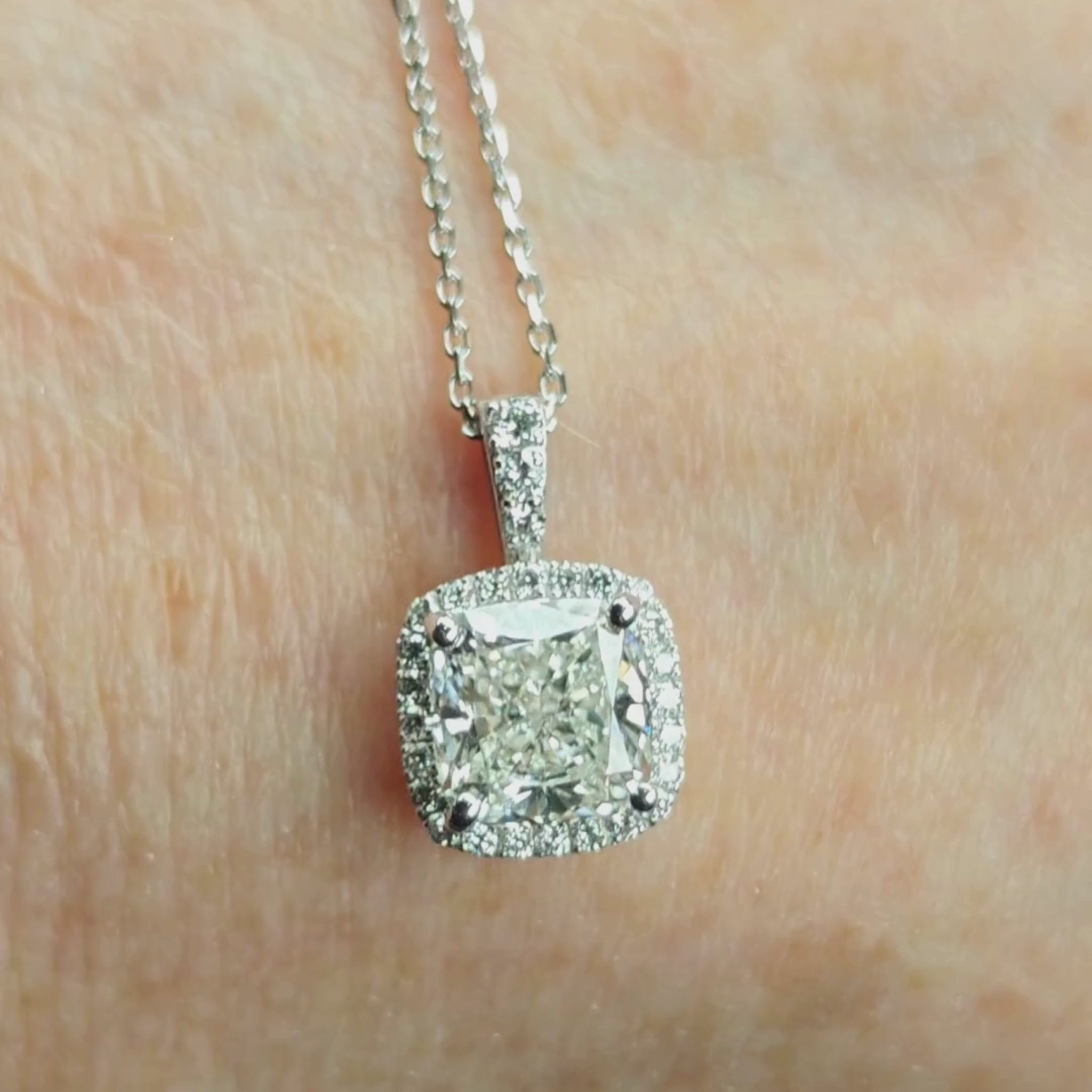 Effortless sparkle, serious impact. This pendant centres on a 2.00ct cushion cut diamond, framed by 0.20cts of round brilliant halo diamonds and an exquisite diamond-set bale. Clean lines, bold sparkle, endless wearability.