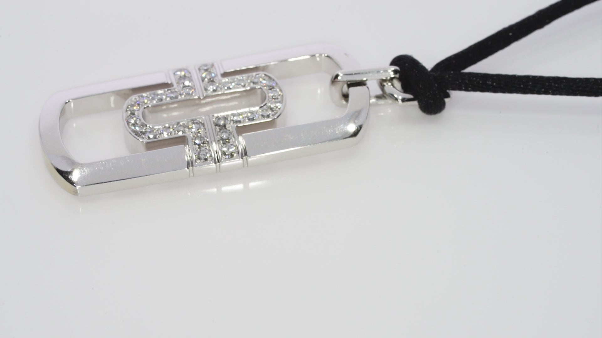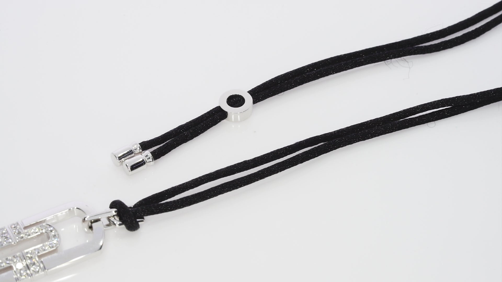 Featuring a clean open-frame design crafted in 18ct white gold weighing approximately 16.36 grams and set with 0.65cts of natural round diamonds, all certified F-G colour and VS-SI clarity. The diamond-set center brings a touch of refined brilliance while preserving a strong, minimal presence, and the black cord introduces a contemporary ease that makes the piece versatile, stylish, and effortlessly wearable every day.