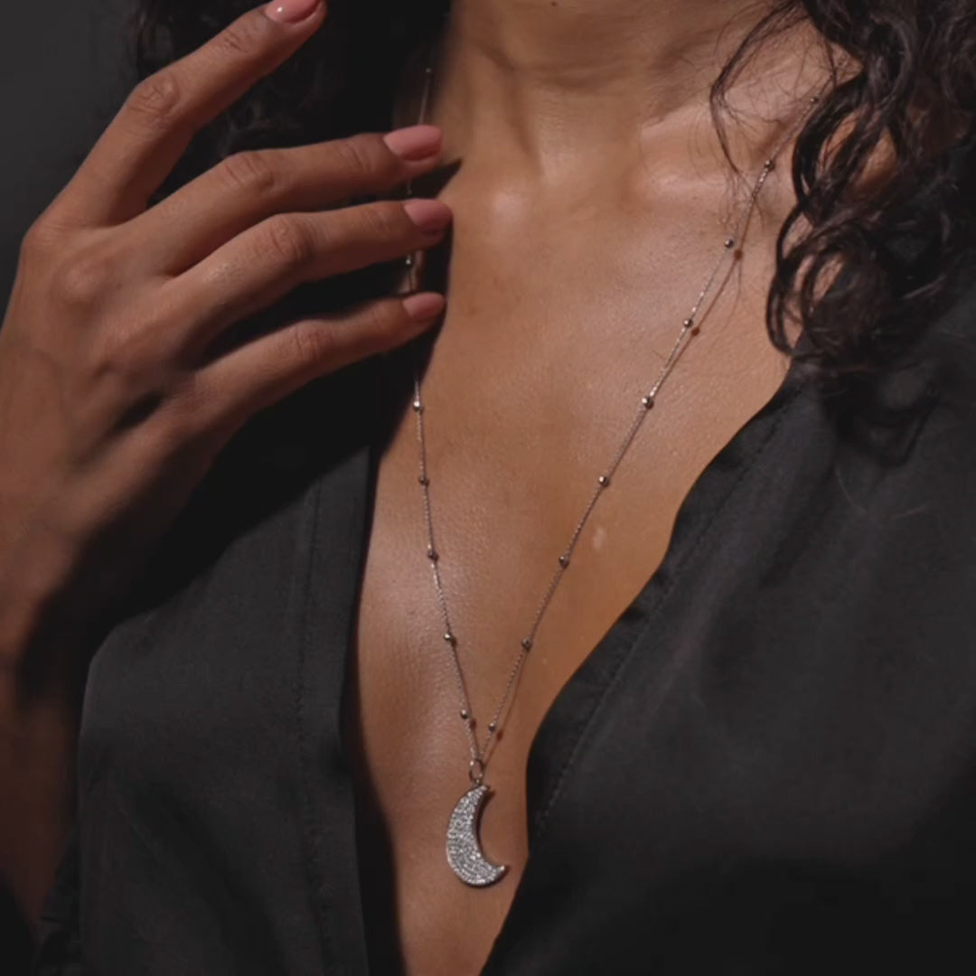Add a touch of modern elegance to any outfit with our beautiful long Moon necklace. A favourite of Rhona’s, she loves to layer with a tennis necklace or a solitaire diamond pendant. Wear it alone over a dark knit in the winter, or with a plunge neckline in the summer!