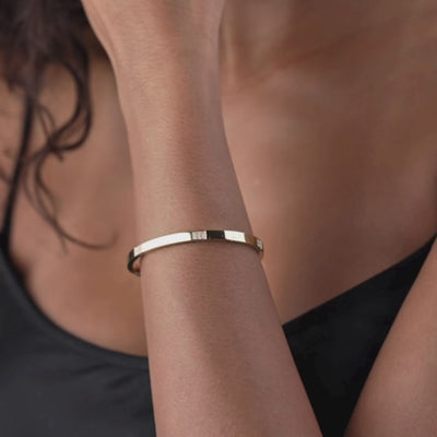 Our luxury solid gold and diamond Breton bangle is designed to be a staple piece in your jewellery line up. Perfect to mix and match with other pieces for an elegant, stacked look. Featuring straight edges for a sleek, modern feel and set with 0.51cts of round brilliant cut diamonds in clusters on the top and sides of the bangle for added luxury.