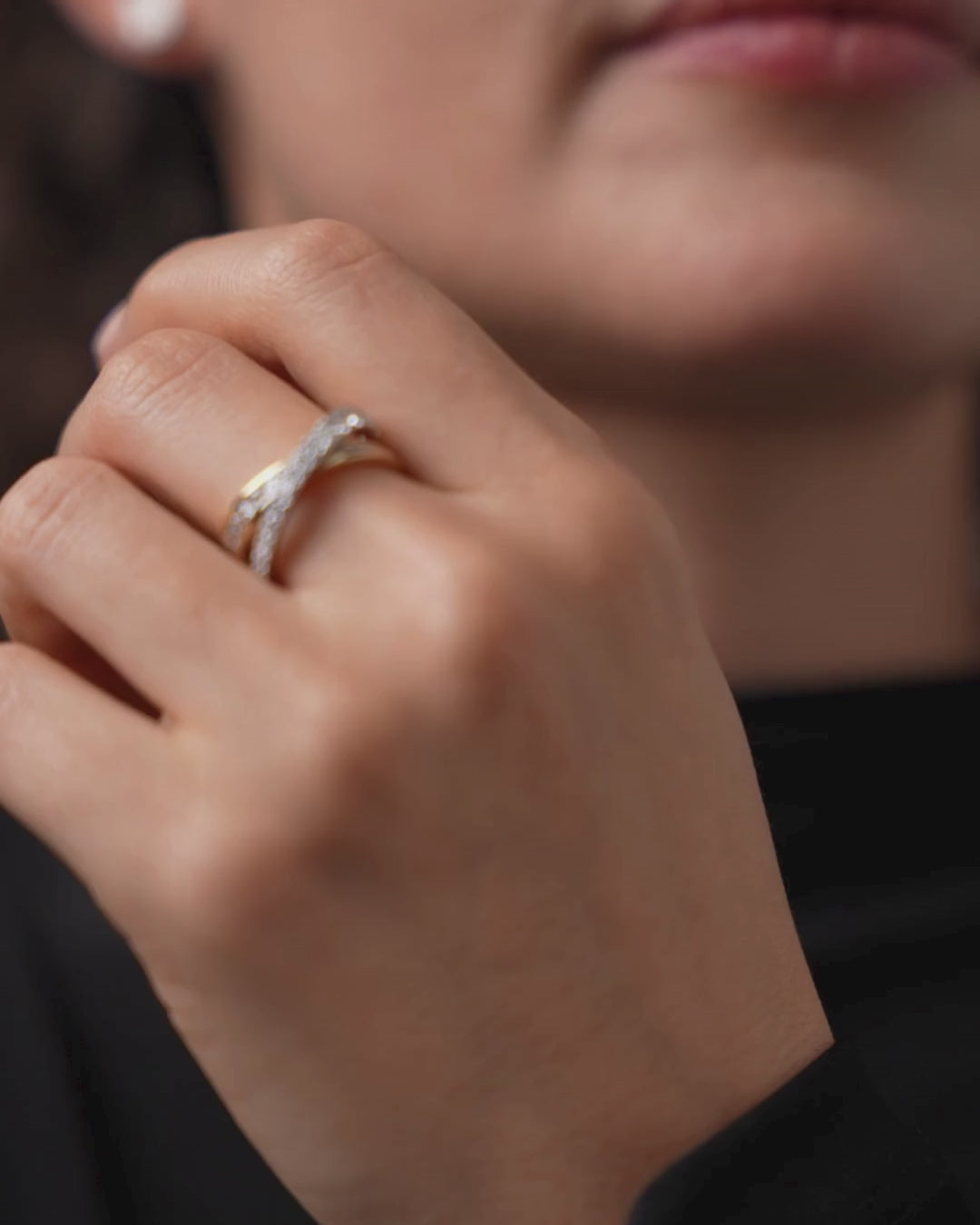 The Coco Criss Cross Ring is an absolutely stunning arrangement of round brilliant cut diamonds, set over two different strands of platinum and 18ct yellow gold. The diamonds are gently graduating in size over both strands to create a unique, dazzling display.